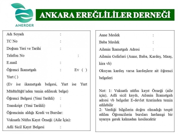 Bu çerçevede ekonomik yardıma ihtiyacı olan, derslerinde başarılı, Ankara’da Üniversite okuyan sınırlı sayıda öğrencilerimize burs desteği sağlanacak olup, burs talep eden öğrencilerimizin ekte yer alan bilgileri doldurarak ve istenen belgeleri ekleyerek anerder2013@hotmail.com mail adresine 11 Ekim 2024 tarihine kadar göndermeleri gerekmektedir.